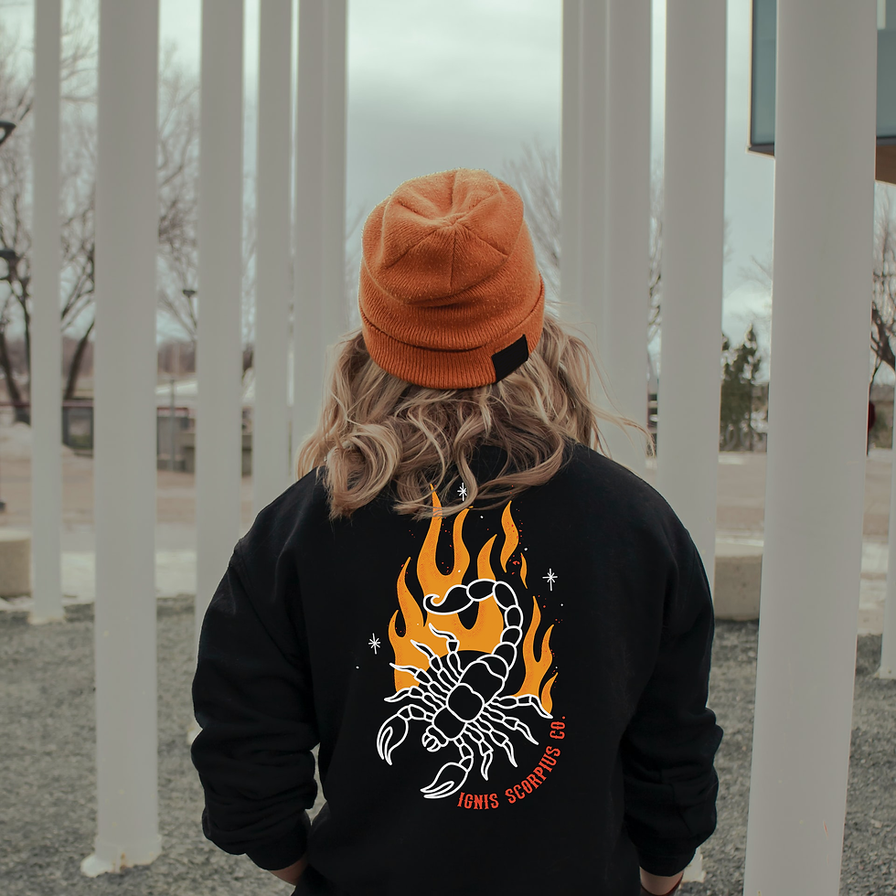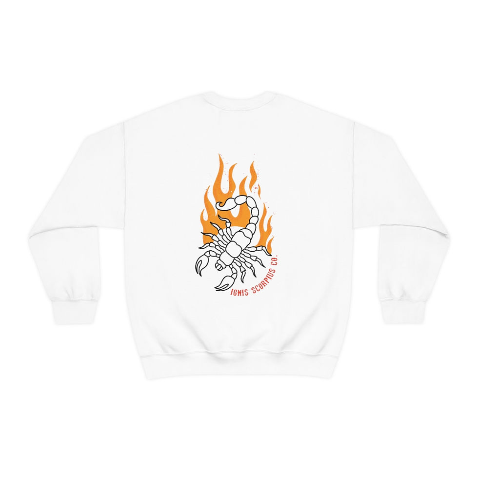 Stand out from the crowd with this unique scorpion graphic of our original tattoo inspired art. This unisex heavy blend crewneck long sleeve sweatshirt is pure comfort. Our alternative graphic sweatshirt features our 'Ignis Scorpius Text' and 'Circa 1989' logo with a scorpion tail ready to sting on the front, and our 'O.G. Ignis Scorpius Co.' logo graphic largely displayed on the back. This sweater can be rocked by men and women alike.